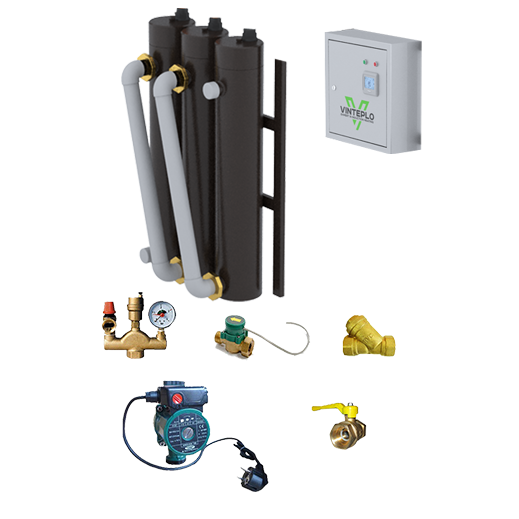 Вихревой индукционный нагреватель мощностью 7 кВт, работает от трехфазной сети 380 В. Нагревает теплоноситель до 95°С, при максимальном рабочем давлении системы до 3 МПа. Диаметр присоединительных патрубков 25 мм. Сечение одной жилы медного силового кабеля, не менее 2.5 мм².